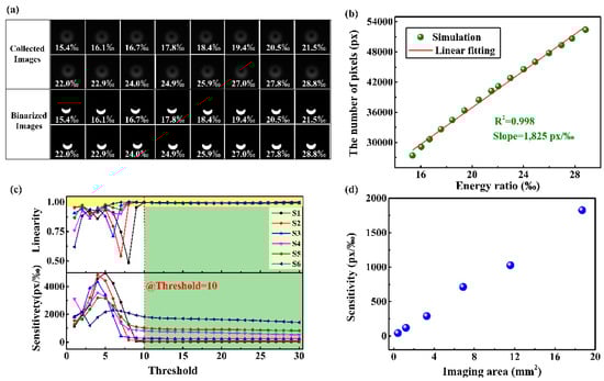 Numerical calculation of sensing principle. (a) The collected and binarized images of the intensity distributions in different energy ratio between the OAM0 and OAM1 mode; (b) the relationship between the energy ratio and the number of pixels with the gray value of 1; (c) the evolution of sensitivity and linearity of the sensor with the changes in imaging area and thresholds, and the size of imaging areas denoted by S1–S6 are 0.41 mm2, 1.21 mm2, 3.27 mm2, 6.88 mm2, 11.58 mm2, and 18.69 mm2, respectively; (d) the relationship between sensitivity and image area.
