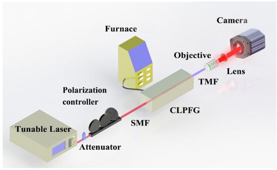 The experimental setup of the proposed sensing method is shown in Figure 4, which is mainly composed of a tunable laser emitting single-wavelength light, a CLPFG that excites the OAM1 mode, and a CCD that collects the intensity distribution. The tunable laser (Agilent 81940A, USA) has relatively stable power while emitting. When the output laser exceeded 1 hour, the power fluctuation range was ± 0.0075 dB, which can be negligible. The CLFPG, with a resonant wavelength of 1572.5 nm, was fabricated by twisting the hot-melt SMF. As such, a section of TMF was fused at the end of the grating at an interval of 5 mm to transmit high-order modes in order to facilitate the measurement of the mode field distribution and its changes. We used a compact precision temperature control box (LCO 102 SINGLE, ECOM) as the temperature generator. The device can produce temperature changes in the range of 0–100 °C, with an accuracy of 0.01 °C. The CLPFG of the measuring section was placed in a closed temperature control box, and both ends of the optical fiber passing through the temperature control box were fixed on the optical fiber clamp. Through heat conduction, CLPFG can obtain the same temperature change as the temperature control box, so as to study the temperature sensing performance of the sensor. The operation wavelength was selected to be 1570.5 nm, in which the OAM0 and OAM1 mode were in the state of coexistence. It cannot be ignored that all-optical fiber devices are fixed on the platform, which helps to collect the stable images. The temperature rose from 30 °C to 100 °C, at an interval of 5 °C, and each temperature remained for 5 min in order to ensure that the grating was in a state of constant temperature. The CCD (Hamamatsu, C12741-03, Japan) has a resolution of 640 × 512 px and the size of the single-pixel is 20 µm × 20 µm. It recorded the changes in the superimposed mode intensity. According to the display, the intensity of the images must not be exposed, so as to achieve a good match between the intensity distribution and the gray value of images. What’s more, the type of images collected by the camera is uint8, which has a gray-level range of 0–255.