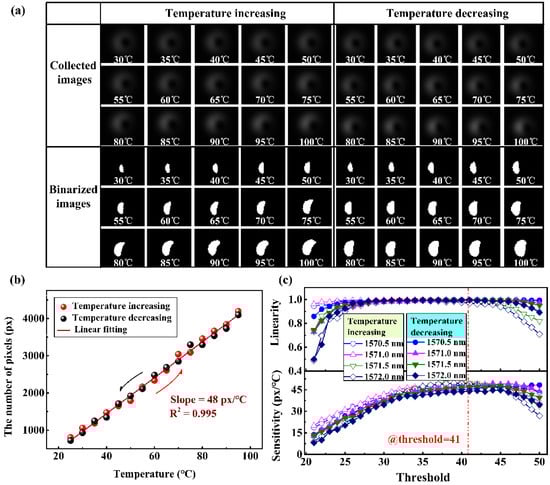 Experimental measurement results. (a–c) Experiment data with imaging area 7.83 mm2 with temperature increasing and decreasing: (a) the collected and binarized images of the intensity distributions from 30 °C to 100 °C at 1571 nm; (b) experiment data of the temperature test and its linear fitting; (c) the evolution of sensitivity and linearity with different operation wavelength and threshold.