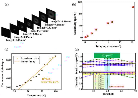 In theory, the sensitivity can be enhanced by changing the number of participating pixels. Thus, we studied the evolution of sensitivity under different imaging areas. The intensity distributions shown in Figure 6a, represent the different imaging areas of 0.15 mm2, 0.85 mm2, 2.31 mm2, 3.76 mm2, 7.83 mm2, 9.26 mm2, and 16.38 mm2, respectively. In Figure 6b, the corresponding sensitivities are 1 px/°C, 5 px/°C, 14 px/°C, 27 px/°C, 48 px/°C, 53 px/°C, and 103 px/°C, respectively. When the imaging area was expanded to 16.38 mm2 within the limited experiment condition, we repeated the experiment setup above. The corresponding results are shown in Figure 6c. The temperature sensitivity 103 px/°C was achieved at a threshold of 60, which is larger than the sensitivity of the imaging area of 7.83 mm2. Since the CCD can recognize one pixel at least, the theoretical temperature resolution of the sensing technology is 0.0097 °C. In addition, according to the method obtained in Figure 5c, we explored the evolution process of the different working wavelengths under the different thresholds in the imaging area of 16.38 mm2, as shown in Figure 6d. By optimizing the optical aperture of the imaging element, the highest sensitivity (of about 809 px/°C) may be obtained by further enlarging the imaging area. In the experiment, the sensitivity can be improved from 1 px/°C to 103 px/°C, under the current system conditions.
