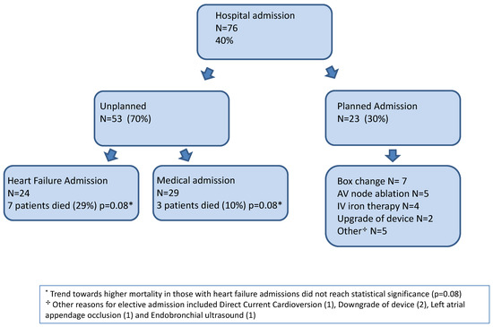 The mortality of patients with unplanned admissions was 21%; there was a trend of higher mortality in those with HF admissions compared to non-HF admission, but this did not reach statistical significance (29% vs. 14% p = 0.16). A total of 23 (12%) patients had an elective admission and underwent AV node ablation (5 patients), routine generator replacement (7 patients), intravenous iron therapy (4 patients) and 2 patients had device/lead upgrades for increased functionality. (Other reasons for elective admission included 1 DCCV, 2 downgrades, 1 EBUS and 1 LAA occluder) (see Figure 2).