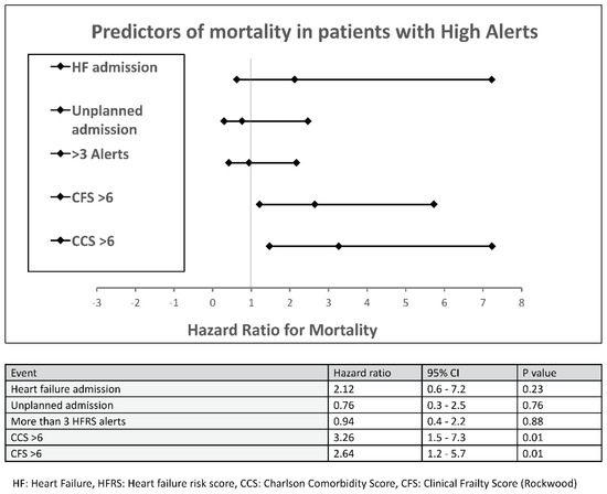 Predictors of mortality in patients with high-risk alerts. HF: Heart Failure, HFRS: Heart failure risk score, CCS: Charlson Comorbidity Score, CFS: Clinical Frailty Score (Rockwood).