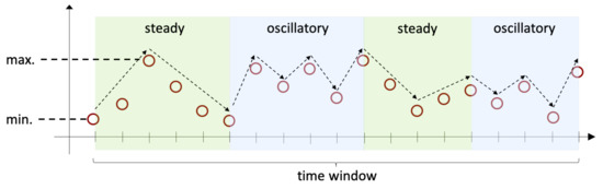 - Oscillatory variation. This pattern refers to the case in which the value of the data points in the time window go up and down from one time step to the next one. Specifically, if we consider 3 consecutive time steps , , and , where , we have either that at times and the values of the corresponding data points and are strictly higher than the value of the data point at time , or that at time the value of the corresponding data point is strictly higher than both the values of the data points at and at . This pattern is illustrated on the blue areas shown in Figure 2.