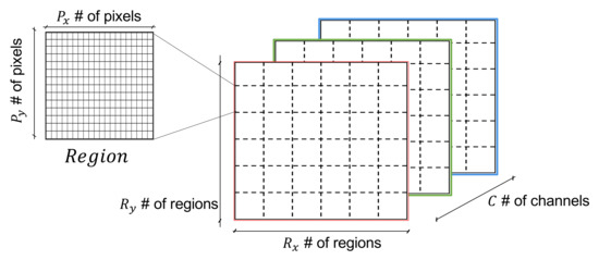 In order to obtain images that purposely exploit the locality strength of CNNs, we seek to consistently represent specific pattern(s) in specific regions of the images. To this end, we consider an image as an empty ‘canvas’ or number of regions and C number of channels. Black and white (B & W) images correspond to , while color (RGB) images to . Each region is composed of number of pixels. A canvas divided into regions as explained is illustrated in Figure 3.