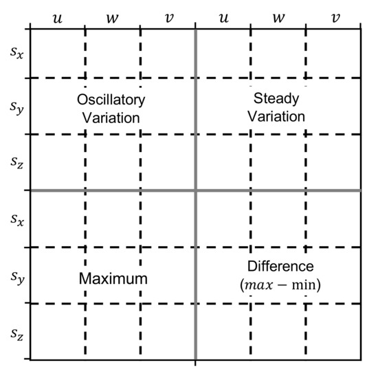In this paper, we consider the following specific design for the images. The canvas is split into 36 regions () and these cover a total of 4 quadrants, which correspond to 9 regions (). This canvas is depicted in Figure 4, where it can be seen that the oscillatory and steady variations are placed on the top-left and top-right quadrants, respectively. On the other hand, range patterns are placed at the bottom, namely the maximum is on the bottom left and the difference between maximum and minimum is on the bottom right.