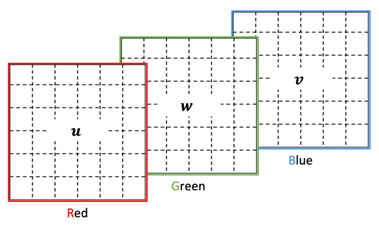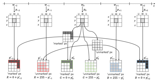 For this option we propose two different alternatives. The first one, depicted in Figure 7, is a simple assignment of the current window w, the window(s) u before the current one, and the window(s) v following the current one to each of the color channels.