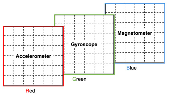 In this option, the patterns of each inertial sensor is represented on a different color channel, as illustrated in Figure 9. This can be a good option when dealing with inertial measurement units (IMUs), which typically contain an accelerometer, a gyroscope, and a magnetometer. However, it has the clear limitation imposed by the number of available color channels, which makes it unsuitable when considering more than 3 inertial sensors. For such a case, we propose below the augmentation of the canvas.