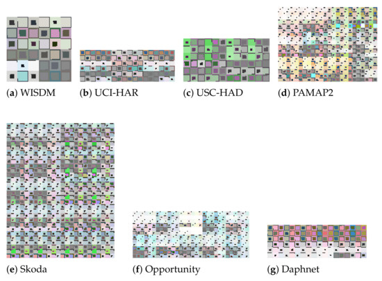 Samples of the image representations: (a) WISDM (120 × 120 px.), (b) UCI-HAR (180 × 60 px.), (c) USC-HAD (120 × 60 px.), (d) PAMAP2 (120 × 90 px.), (e) Skoda (120 × 150 px.), (f) Opportunity (150 × 60 px.), and (g) Daphnet (180 × 60 px.)