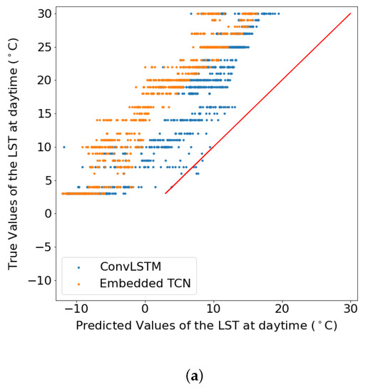 Up to this point, this work focused on the prediction of values of the daytime land surface temperature in June 2020. We repeated the process described above to predict the values of the daytime land surface temperature in April 2020 and May 2020. In each of these cases, we reduced the number of training images by two and one, respectively. In Figure 11, the blue dots show the PCC between the predicted and the true values for each of the three months when the E-TCN was used while the orange dots show the PCC when the ConvLSTM model was used.