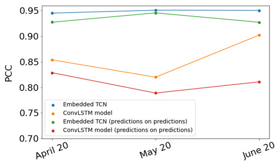 Recall that to predict the values in March 2020, both of our models used timesteps images and predicted timesteps images shifted by one time step. The last predicted image represents the values of the daytime land surface temperature in March 2020. Thus, finally, we used these timesteps predicted images as input to our models in order to predict timesteps images where the latter represents the values of the daytime land surface temperature in April 2020. We repeated this process three times in total. The green and red dots in Figure 11 show the PCC resulted following this process when the E-TCN and the ConvLSTM model is used, respectively, for each of the three months. This process is usually referred to as “predictions on predictions” method. For each month, the PCC is smaller when we used the “predictions on predictions” method than when we used the method described in the above paragraphs. Figure 12 presents the PCC between the timesteps predicted images and the timesteps true images when the E-TCN is used.