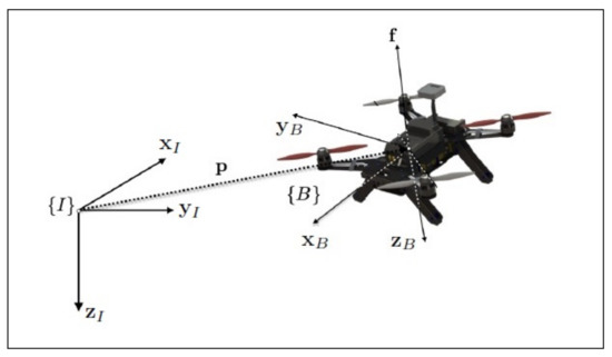 where is the position and m is the mass of the quadrotor. In addition, is the gravitational acceleration, and . The first term on the right-hand side of (5) is gravity in the direction, and the second term, , is the thrust force aligned with the body’s -axis.