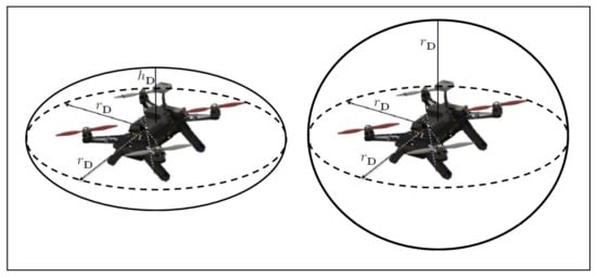 The quadrotor body can be represented as a sphere with radius (right), or an ellipsoid aligned with the axes of the body frame (left). Approximating the drone body with an ellipsoid allows considering the quadrotor’s rotational motion.