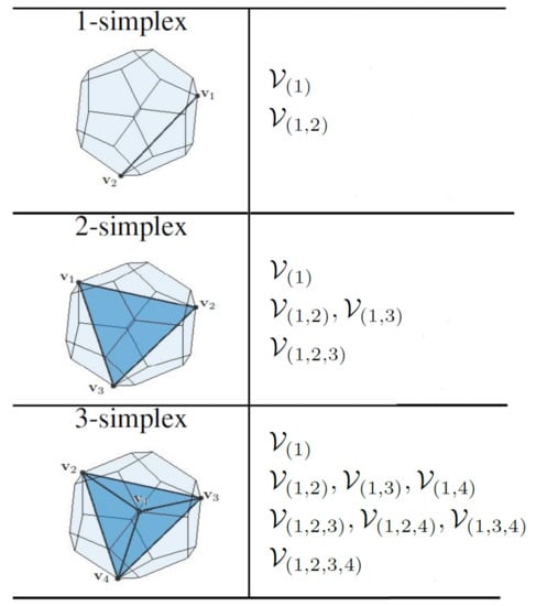An m-simplex is linked to Voronoi regions associated with its vertices, edges, faces, and volume. The list of Voronoi regions that can possibly contain the origin is given in this table. It should be noted that is the latest vertex added to V.