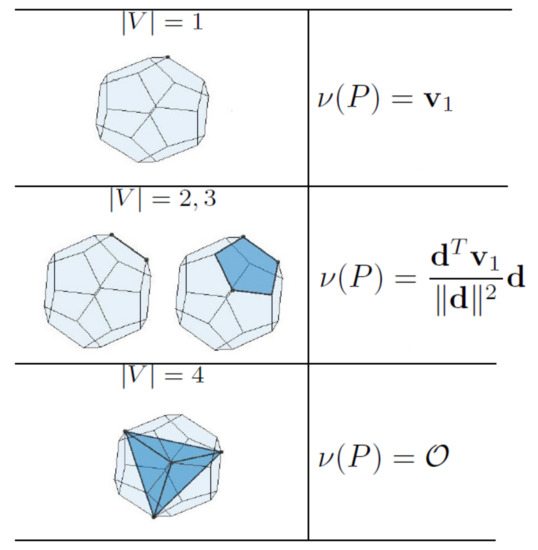 If the inequality (31) holds, then the closest feature of P to the origin can be determined from . Figure 5 shows all possible outputs of Algorithm 2, which can be a vertex, an edge, or a face of P or a tetrahedron inside it, and for each of the cases.