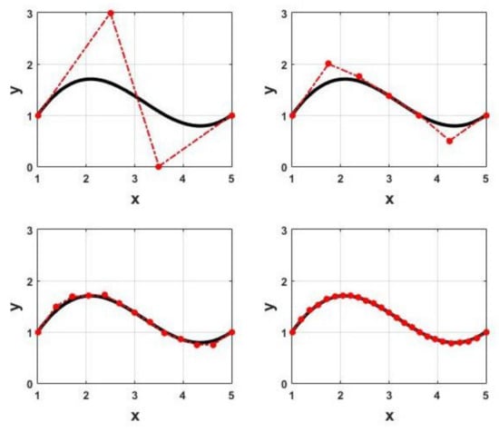 A cubic Bézier curve (top left) is subdivided into two Bézier curves of the same degree (top right) using the de Casteljau’s algorithm. The control polygon generated by recursive subdivision converges to the original Bézier curve ref. [28]. Copyright 2021 IEEE. Successive refinement of the original control polygon after 2 (bottom left) and 3 (bottom right) subdivisions.