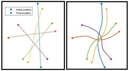 (a) Initial (left) and final (right) position configurations for 18 drones. Each drone is assigned a unique color and a number next to it. (b) Collision−free trajectories for 18 drones switching their positions in a space. The total flight time for the drones to reach their final positions is 5.1 s using the proposed method, which is shorter than the 6.3 s flight time obtained with the BVC.