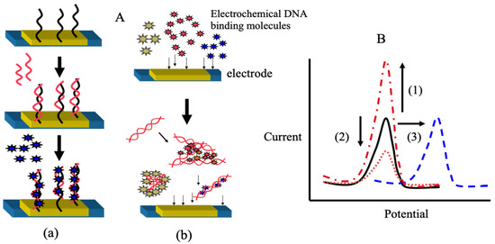 Electrochemical gene sensors with coupling with electrochemical DNA binding molecules (A): Scheme with (a) and without (b) immobilized DNA probes onto electrodes; (B): Type of electrochemical responses based on changes of current and potential. (1) Current increases with the amount of hybrid formed; (2) Current decreases with the amount of DNA; (3) Potential change with the amount of DNA.