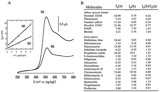 Comparison of electrochemical responses between DNA and various DNA-binding electrochemically active molecules [16] (A): Cyclic voltammograms with electrochemical indicator alone (a) and in the presence of DNA (b). (B): Comparison of Ip(a), Ip(b) and Ip(b)/Ip(a) among DNA-binding molecules. Ip(a) and Ip(b) indicated peak currents at (a) and (b) respectively.
