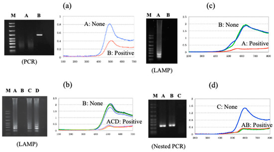 Various applications of our electrochemical DNA sensor (a) Salmonella gene amplified with PCR; (b) Pathogenic E. coli O157 gene amplified with LAMP; (c) Genetically modified maize gene amplified LAMP; (d) Hepatitis B virus (blood samples) gene amplified nested PCR. Each target was tested by electrochemical measurement and gel electrophoresis using positive and negative samples.