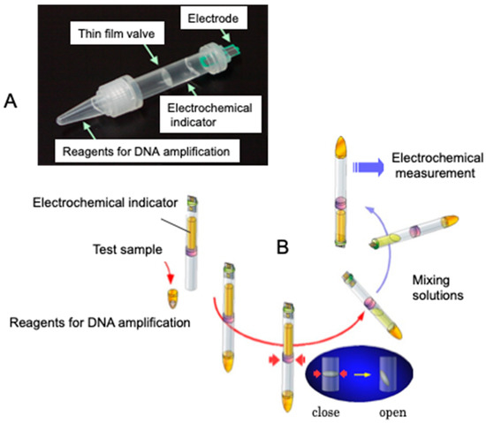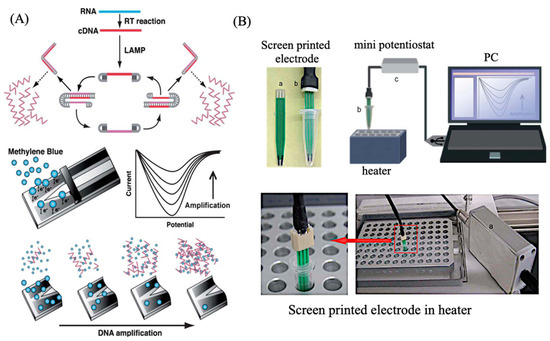 Real-time electrochemical measurements using isothermal gene amplification [20]. (A) Scheme of electrochemical detection of LAMP amplified DNA; (B) Electrochemical measurement system with screen printed electrodes and heater.