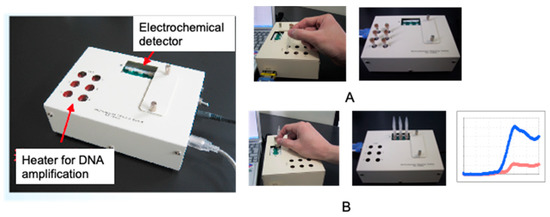 Genetic measurements are important for the rapid diagnosis of infectious diseases, such as coronaviruses, in the field. In this context, the use of electrochemical techniques for genetic measurements has been around since 1960 [2]. Initially, the electrochemical activity of the nucleic acid molecules that make up the gene itself was the focus, and electron transfer was studied directly on the electrode. Later, many studies were carried out on the use of oligo-nucleic acid molecules placed on electrodes to form complementary bonds (hybrids), and to create sensors based on changes in the electrochemical signal. The electrochemical properties of nanomaterials, such as gold nanoparticles and graphene, were also used to amplify the signals for sensitive measurements [3,4]. Although these are mainly amperometric methods to measure electron transfer, methods have also been developed to measure gate potential changes in field-effect transistors and electrochemical impedance changes. In this way, measurements are made by placing nucleic acid molecules on electrodes. Gene amplification reactions, such as PCR, which have already been established for the detection of specific genes and DNA-binding activity with electrochemical activity, can be used to detect specific genes [5]. In Figure 2, single-strand DNA is immobilized on an electrode, and the electron transfer from the intercalating electrochemically active molecule to the electrode, when complementary DNA is bound, can be measured as an increase in the current value [6,7,8]. This has been commercialized by Toshiba Corporation [9]. Our strategy of using intercalating molecules is relatively simple because the DNA can be detected by merely mixing the intercalating molecules with the DNA in solution. That is, there is no need for immobilization on the electrode surface and/or modification of signaling molecules to nucleic acids. Detailed protocols for the intercalator-based electrochemical detection of DNA in solution have been reported [10]. The electrochemical response changes when electroactive molecules intercalate DNA through the formation of an intercalator–DNA complex, and it is dependent on the amount of amplified DNA. DNA amplification is typically performed by PCR. The choice of electrochemical indicators that can be used for this purpose is limited, because, although there are many types of DNA intercalation molecules, the electrochemical signal is very weak in most methods, and some molecules have a good electrochemical signal, but a low affinity for DNA. The most effective and widely used electroactive DNA intercalation molecules for the detection of DNA amplification are methylene blue [11,12,13], osmium–bipyridine-based complexes, bisbenzimidazole trihydrochloride (Hoechst 33258) [14,15,16], and others. The simplicity of this electrochemical method makes it suitable for the development of on-site gene detection devices. Using disposable electrochemically printed (DEP) chips, we have developed a simple intercalator-based DNA biosensor [17]. First, we screened various intercalators (about 20 different types) and observed the effect of DNA binding on their diffusion coefficients (Figure 3). Changes in diffusion coefficients have been associated with the formation of complexes between the DNA and intercalators [16]. In particular, it was observed that the binding of Hoechst 33258 to DNA significantly altered its diffusion coefficient. Furthermore, in order to confirm the presence of a specific gene, the gene was amplified by PCR and the change in the current value upon amplification was measured (Figure 4). Based on this principle, the pathogenic microorganisms involved in food poisoning, such as Salmonella, E. coli, hepatitis B virus and GMO, were examined, and the results of PCR electrophoresis were consistent (Figure 5). Biodevice Technology Ltd. has made a DNA stick with electrodes built into the reaction tube (DNA stick) in which PCR is carried out, which can be mixed with an electrochemical indicator after PCR amplification, as shown in Figure 6 [18]. They have also developed a DNA tester that integrates a temperature heater for DNA amplification and an electrochemical measuring unit as a corresponding measuring instrument (Figure 7).