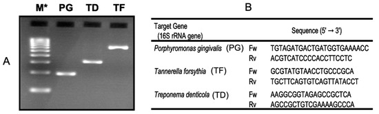 Detection of periodontal bacteria (PG, TF and TD) using PCR amplification [15] (A): Electrophoretic pattern of amplified PCR products. M* molecular size marker; (B): Sequence of PCR primers for periodontal bacteria.