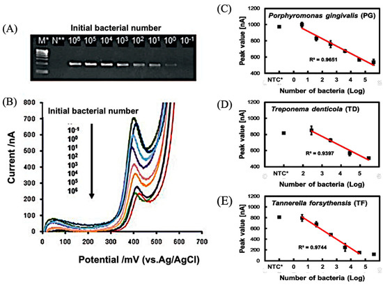 Electrochemical measurement of periodontal bacteria using PCR amplification [15]. (A) Electrophoresis of PCR-amplified genes encoding PG bactetium. Initial bacterial number (101–105), M* (molecular weight marker) and N* (negative control) were indicated. (B) Cyclic voltammograms(0–700 mV) were obtained with PCR amplified genes with different initial bacterial number. Calibration for number of bacteria of PG (C), TD (D) and TF (E).