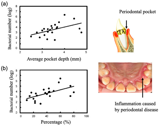 Relationship between periodontal pocket depth and PG bacterial number estimated by our electrochemical method [15]. (a) Plot between the number of PG bacteria and the average pocket depth; (b) Plot between the number of PG bacteria and the percentage of the periodontal teeth in which the periodontal pocket depth was greater than 4 mm.
