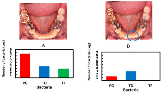 Bacterial number profiles between deepest (A) and shallowest (B) pockets. White and blue circles indicated deepest and shallowest pockets, respectively. PG, TD and TF were periodontal bacteria.