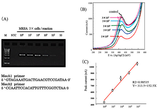 Staphylococcus aureus is found on human skin, nasal cavities, and other body surfaces, and is usually harmless to healthy people, but infection can occur in the presence of wounds. Staphylococcus aureus, which is resistant to the antibiotic methicillin (MRSA), can cause respiratory tract infections, bacteremia, and postoperative infections in immunocompromised patients, through transmission in hospitals. The resistance function of MRSA is due to the inducible production of penicillin-binding protein. The structural gene that controls the production of this protein is mecA. The presence of the mecA gene in Staphylococcus aureus can be used to determine whether the organism is MRSA or not. We performed PCR amplification of the mecA gene using MRSA isolates, and, after 40 cycles of PCR, the products were subjected to agarose gel electrophoresis (Figure 13A) [19]. Specific amplified product (310 bp) was clearly observed in four solutions containing 3 × 106 to 3 × 103 MRSA. When this sample was subjected to electrochemical measurements, the current decreased with increasing bacterial concentration (Figure 13B) [19]. A calibration curve could be constructed from the relationship between the peak current value and the number of MRSA bacteria (Figure 13C) [19]. The regression coefficient was 0.985. This result suggests that the MRSA bacterial count can be directly quantified with high sensitivity and accuracy, without DNA extraction. The time required for the electrochemical measurement after amplification was less than 2 min. A potential clinical application of the method was then investigated using nasal swabs collected from patients. The nasal swabs were subjected to PCR, followed by electrochemical measurements, to determine the amount of colony-forming MRSA. Nasal swabs A, B, C and NTC were subjected to PCR and subsequent gel electrophoresis (Figure 14A) [19]. Specific amplified product (310 bp) was clearly visible in samples A and C, but not in NTC and sample B. The results of electrochemical current measurements of the same PCR mixtures are shown in Figure 14B [19]. These results were in agreement with the semi-quantitative results obtained by culturing the samples in a hospital laboratory (Supplementary Materials Table S1).