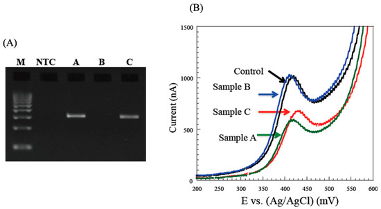 Detection of MRSA from patient samples [19]. (A) Electrophoresis of PCR-amplified genes encoding MRSA. Patient samples of A,C (positive) and B (negative) NTC: negative control; (B) Cyclic voltammograms (0–600 mV) were obtained with PCR amplified genes with patient samples.