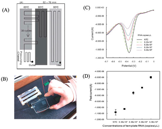 RT-PCR microfluid chip with screen printed electrode [12]. (A) Microfluidic RT-PCR chip with fixed temperature heaters of 63 °C, 95 °C and 50 °C; (B) Photograph of (A); (C) Square Wave Voltammetry of RT-PCR products of different copies of RNA samples; (D) Relationship between of peak currents and RT-PCR products of different copies of RNA samples.