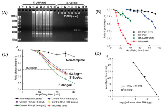 Influenza virus measurement using isothermal gene amplification [20]. (A) Electrophoresis of RT-LAMP and RT-PCR-amplified genes encoding Influenza virus (B) Comparison of electrochemical responses of RT-LAMP and RT-PCR (C) Electrochemical responses with different copies of RNA and influenza sample (D) Calibration of influenza RNA.