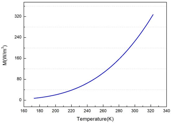 Combined with the temperature acquisition range of this paper, which is about 173–323 K, calculate the amount of the radiation corresponding to the temperature directly output by the infrared thermometer. The calculation relationship is shown in Figure 1. Since the temperature acquisition range in this paper is between 173 and 323 K, only the radiation amount corresponding to the temperature in this range is output, as shown in the figure. The above is the first step in establishing the conversion relationship between temperature and radiation. The Equation (7) applies to any type of sensor, and the formula does not limit the temperature range.
