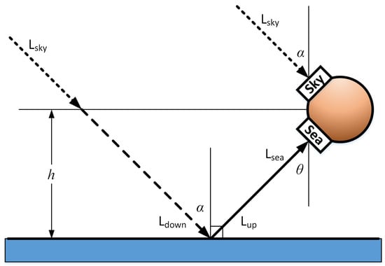When the temperature measurement equipment deployed on the sea or on the mobile platform measures the sea surface temperature, the observed temperature not only includes the actual sea surface temperature, but is also affected by other factors, such as the sky and air []. The radiation amount of an ideal blackbody can be calculated directly by Planck’s formula. The actual radiation amount of an object should be multiplied by the emissivity value of this object by the blackbody radiation at the equivalent temperature, the effective emission radiation, which is the value when applied to seawater. Furthermore, the emissivity is known as the water-leaving radiance [].