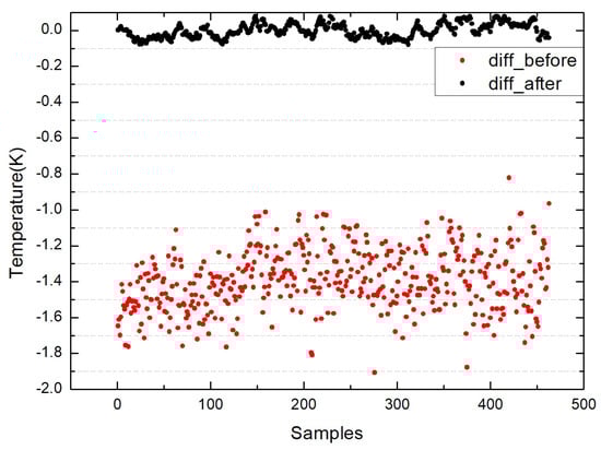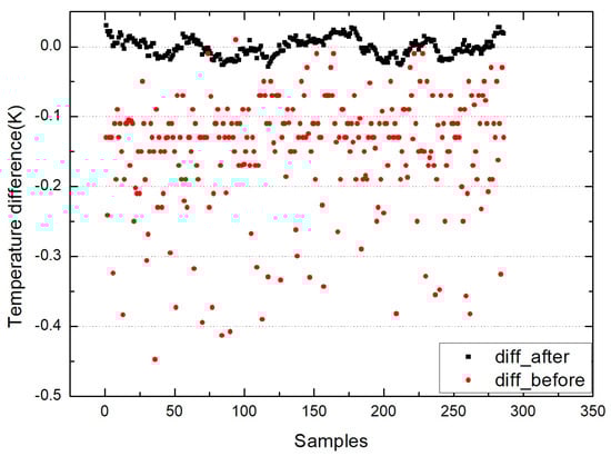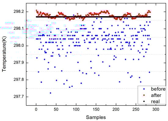 The figures above show the output of all measurement data when using standard blackbody calibration. Figure 5 shows the measurement results of an MLX90614 infrared thermometer directly aimed at high-temperature blackbody (BB1_MLX), the ambient-temperature blackbody (BB2_MLX), and the standard blackbody (BB_MLX). These data are the direct output result of MLX90614, which is not processed by the algorithm in this paper, the bias is −0.150; the standard deviation is 0.083. Figure 6 shows the output result of direct alignment to the blackbody (before), the final output result after algorithm correction (after), and the actual temperature of the standard blackbody (real). The corrected result is clearly closer to the actual temperature and more stable. Figure 7 shows that the deviation of the MLX90614 infrared thermometer directly measures the standard blackbody from the actual temperature and the deviation from the actual temperature after algorithm correction. The bias before algorithm processing is −0.150; the standard deviation is 0.083. The deviation from the actual temperature after treatment was within ±0.035 K, the bias was 0.007, and the standard deviation was 0.013. By calculating the radiation through an algorithm, the thermometer with the original accuracy of 0.5 K can be increased from 0.5 to 0.035 K.