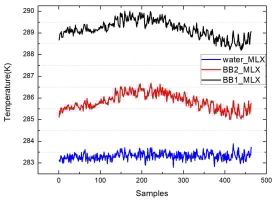 The infrared thermometer directly measures the output values of the high-temperature blackbody (BB1_MLX), ambient-temperature blackbody (BB2_MLX), and water surface (water_MLX).