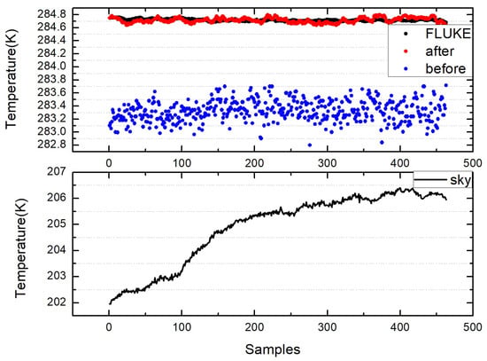 This work used the MLX90614 infrared thermometer, which integrates the infrared induction thermopile detector chip and the signal processing dedicated integrated chip. The official information of the MLX90614 infrared thermometer states that the accuracy of this thermometer reaches 0.5 K, and the resolution is 0.02 K []. The algorithm part of this article is not limited to the thermometer used in this article, and other types of infrared temperature sensors from other manufacturers can also achieve similar accuracy. When the infrared thermometer measures the target temperature, the measurement results of the instrument will be affected by its factors and the environment. In order to reduce the influence of these factors on the measurement results, high-temperature black bodies and ambient-temperature black bodies are introduced to improve accuracy [,].
