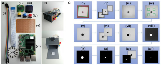 Open-source drivers and scripts that accompany the hardware components were downloaded and installed on the Raspberry Pi 4 via Github. The OLED is run with the python package “adafruit_CircuitPython_ssd1306”. The LED ring runs with “rpi-ws281x”. The camera interface is facilitated by the PiCamera API. Communication from the buttons to Raspberry Pi are handled through the python package “RPi.GPIO 0.7.0”. Other open-source licensed code was also used for functions related to image pre-processing [19,20,21]. All software packages hold open-source licenses. The post-processing algorithm was developed in-house, with the OpenCV computer vision library and the PiCamera API. Custom button call-backs and a shell program that initiates the user interface upon device start-up were also developed in-house. A Jupyter notebook detailing the algorithmic steps for image processing and signal quantification, as well as all source code, is available in the repository of supplemental information available at https://github.com/SMR-83/Open_Reader (accessed on 20 February 2022).