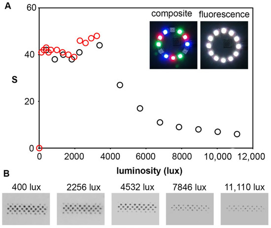 Impact of luminosity in imaging conditions using composite white light with and without fluorescence (shown in inset): (A) Impact of light intensity (lux) on densitometric signal S with fluorescence (black) and without fluorescence (red); (B) Photographs of the same calibrator taken with fluorescence at different luminosity values.