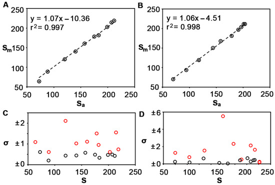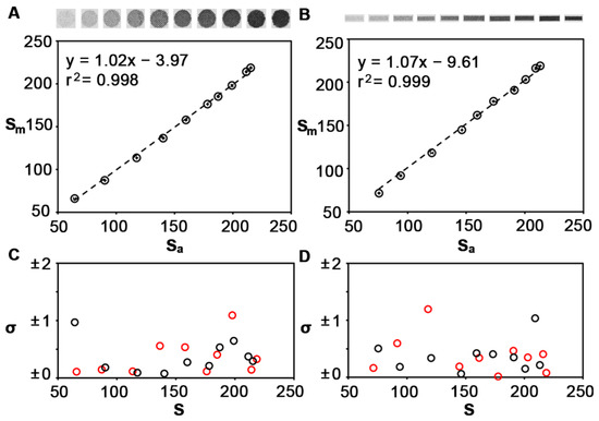 Comparison of smaller signals obtained using the manual method (Sm) or the automated method (Sa) for quantifying the pixel intensity. Correlation plots when the spots are shaped like a small circle (A), or a small rectangle (B), circles are the mean and error bars are the standard deviation (n = 3). Standard deviation (σ) associated with colorimetric signals S obtained with the proposed software (black) or with the manual method (red) (C,D).