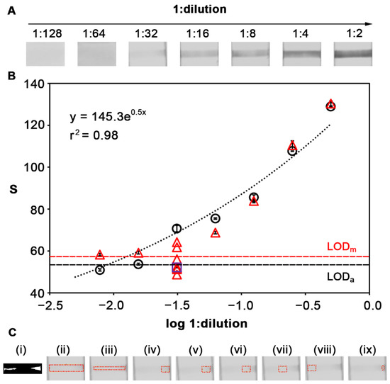 Colorimetric detection of LFIA for host antibodies against SARS-CoV-2: (A) Photographs of the assays; (B) signal quantification with the automated software (black dots) or the manual method (red triangles and purple square), where error bars are the standard deviation of 3 measurements on the same LFIA, LODm is the limit of detection obtained with manual method, and LODa is the one obtained with the automated software; (C) ROI for the 1:32 samples obtained with the automated software (i) or through manual selection that gives rise to the different results reported for sample 1:32 (ii–ix).