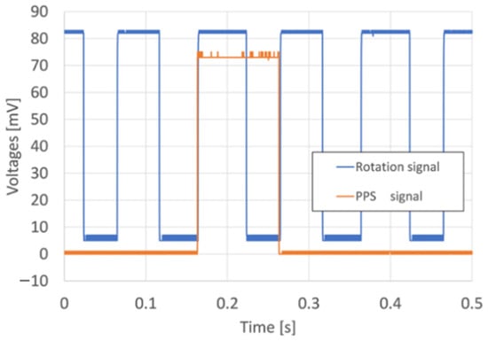 Example of a rotation signal from a proximity sensor (blue line) and PPS signal from GPS module (orange line).