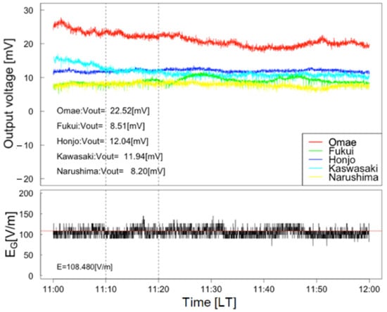 Top panel: Output voltages during fair weather obtained by sensors deployed in Ashikaga city during the period 11:00–12:00 (LT) on 16 November 2020. Bottom panel: Waveforms of fair-weather surface electrostatic field during the same period as top panel.