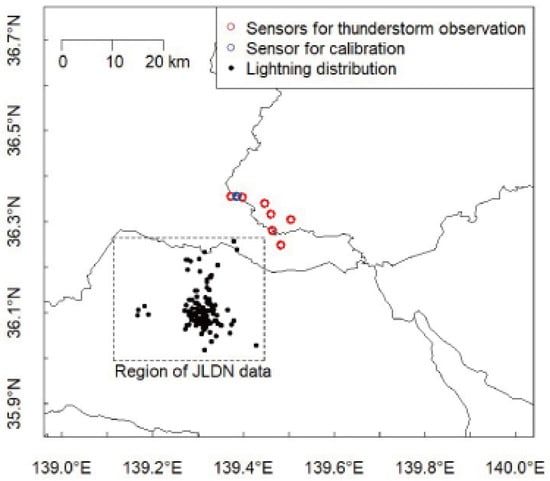 Distribution of the EFM systems running during oncoming thunderclouds on 27 August 2020. Blue circles are the location of a station for calibration. Black dots indicate the spatial distribution of lightning discharges obtained by the Japanese Lightning Detection Network (JLDN) during 0:40–1:40 (LT) on 27 August 2020.