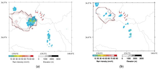 Distribution of rain intensity at 2 km height estimated by C-band radar at 1:40 (LT) (Panel (a)) and 2:10 (LT) (Panel (b)) on 27 August 2020. Black and red lines represent echo-top height in every 1 km and 5 km, respectively.