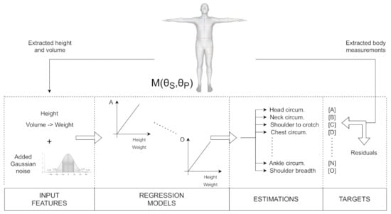 An overview of the linear regression model for a single sample from the statistical model. The sample mesh is defined using the shape and pose parameters, . Both input and output are extracted from the sample template mesh, . The input consists of height and weight. Weight can be either available in the dataset or estimated using the calculated mesh volume. The output consists of the 15 body measurements (A–O), which are listed in Table 1. To account for the errors in self-reporting height and weight, we model height and weight as stochastic variables by adding Gaussian noise to the input. A linear regression model is fitted to each of the 15 body measurements.