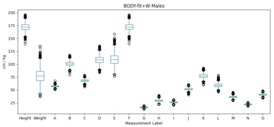 The method is shown in Figure 1. Each human body sample i is defined by 10 shape parameters, , and 63 pose parameters, . The height and the 15 body measurements of the model are extracted from the template mesh. The input to the model consists of height (h) and weight (w). Weight should be available in the dataset; otherwise, it can be estimated from the calculated mesh volume. The output consists of the 15 other body measurements (A–O). The measurement names are listed in Table 1, and their extraction is described in Section 3.2. Then, the linear model for the j-th measurement is described as: