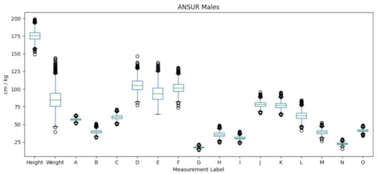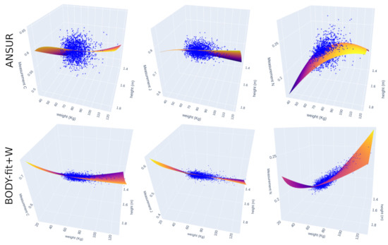 The differences can be explained by the fact that these body measurements are less dispersed in the height–weight space, as shown in Figure 7, even though the volume, height, and weight are modeled as stochastic variables. This might suggest that certain body measurements of the bodies from the synthetic population retain a linear relationship with height and weight, even though Gaussian noise has been added to input. Another reason might be that the human body populations of the two datasets are significantly different w.r.t. to these measurements. ANSUR represents the population of military personnel, while the original population of BODY-fit subjects are probably different.