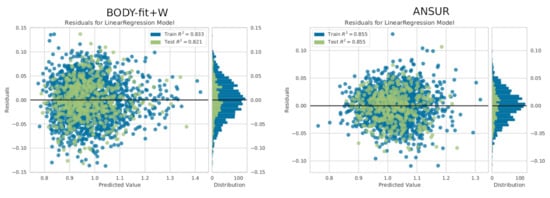 In this section, we verify the three assumptions of linear regression regarding residuals (homoscedasticity, independence, and normality) and check the p-values and scores for the regression models of each body measurement. Figure 4 shows the residuals for the BODY-fit+W and ANSUR models on train and test splits. The variance of the residuals is generally constant for all the values of both models, which satisfies the homoscedasticity assumption. The values are relatively randomly spread, which satisfies the independence assumption. Finally, as shown in the right sides of the two figures, the means of the residuals are zero and they are normally distributed, which satisfies the normality.